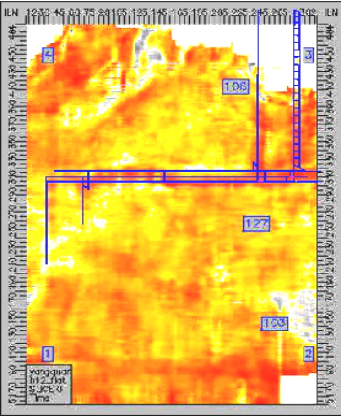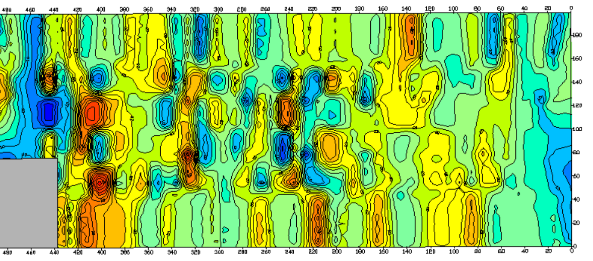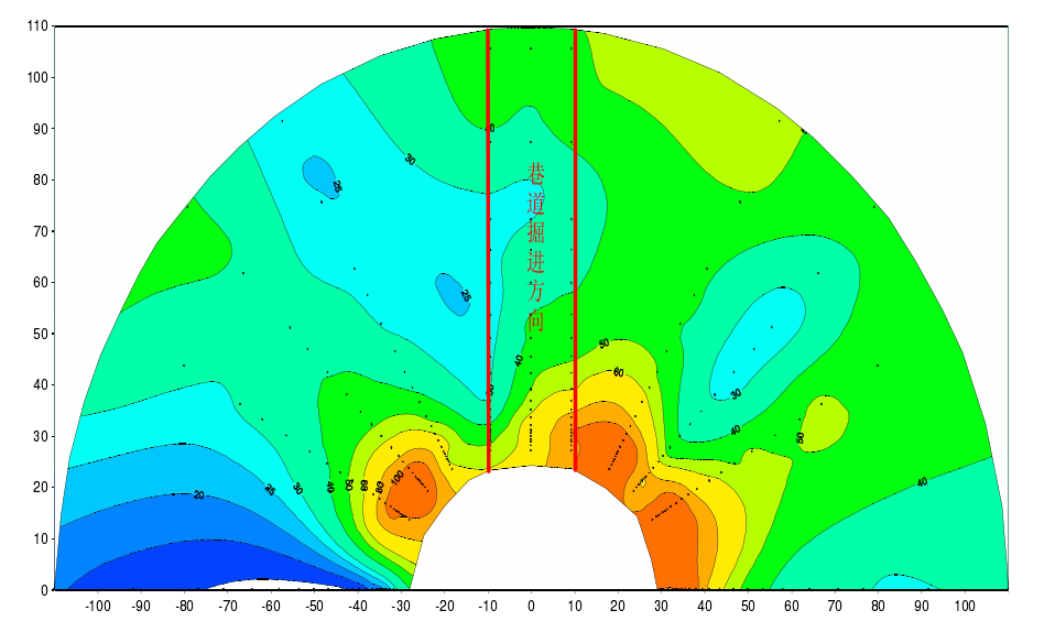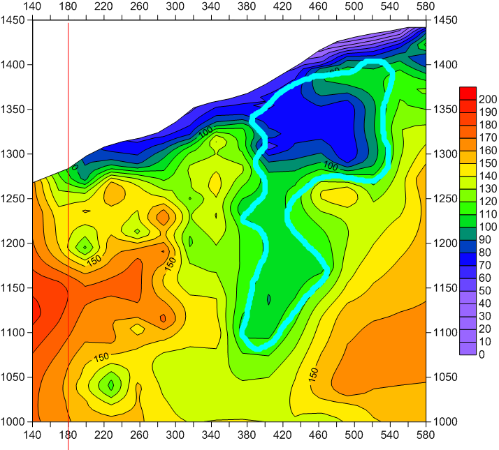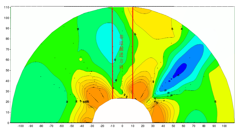 下圖為沿頂板方向探測得到的瞬變電磁法視電阻率等值線圖。從圖中可知,巷道迎頭左側(cè)前上方(沿探測方向)約40-80米范圍視電阻率相對較低,可解釋為該地段內(nèi)頂板砂巖裂隙發(fā)育具含水性。