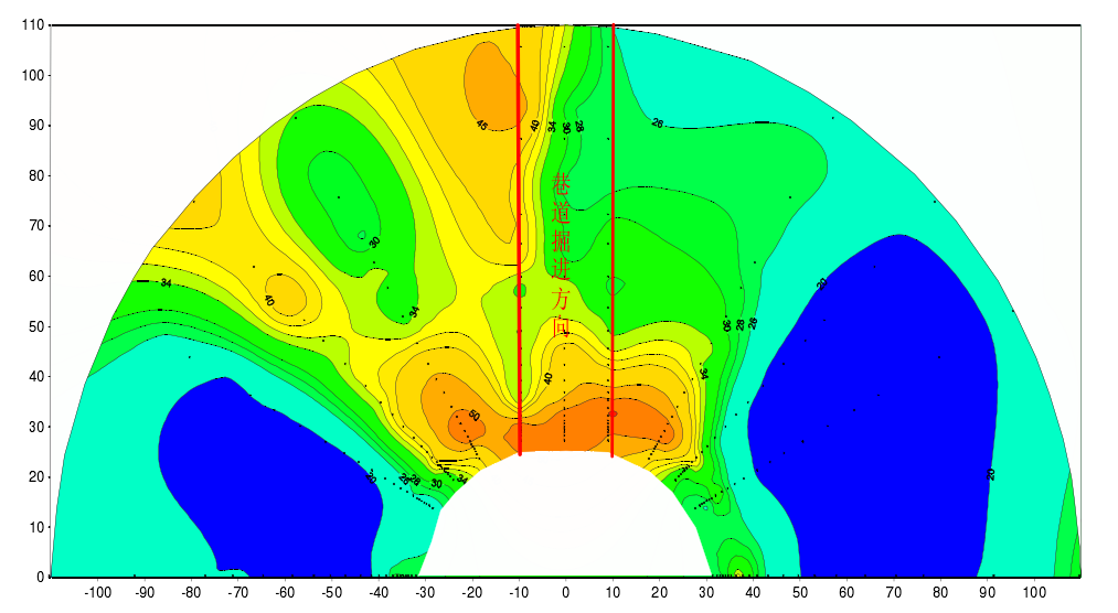 下圖為為沿順層方向探測得到的瞬變電磁法視電阻率等值線圖。從圖中可知,總體視電阻率值相對較高,巷道迎頭前方40-90米左側(cè)幫地段視電阻率等值線發(fā)生變化,存在一個(gè)相對低阻封閉的區(qū)域,該地段可能發(fā)育小構(gòu)造,因?yàn)槠鋵?yīng)的視電阻率最小值大于25 ,巖性以細(xì)砂巖為主具具含水性。